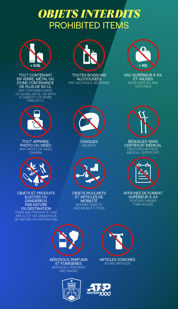 For security reasons, it is strictly forbidden to bring specific items into the Paris La Défense Arena (see list of prohibited items below). These objects may be left in a locker at the entrance.