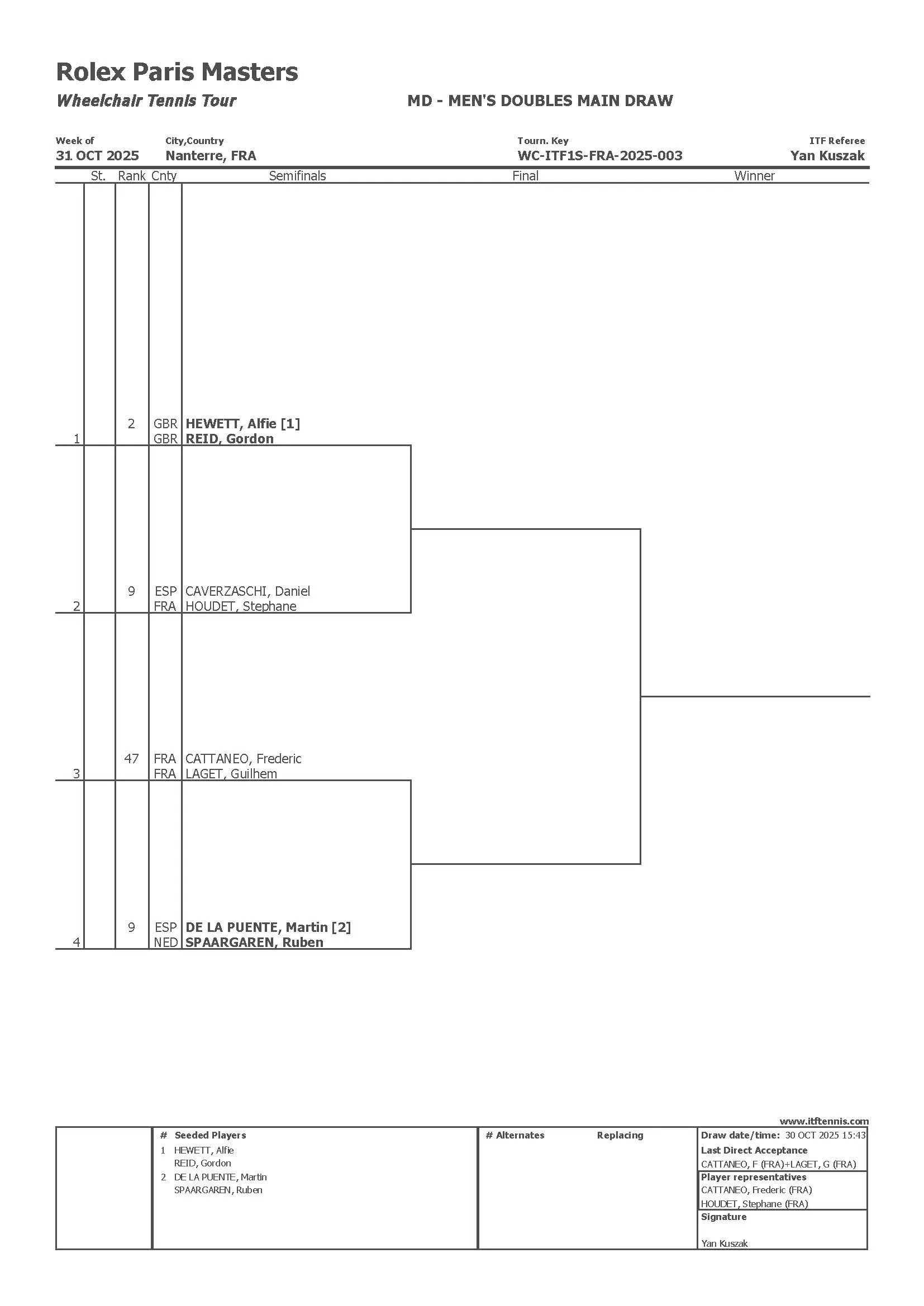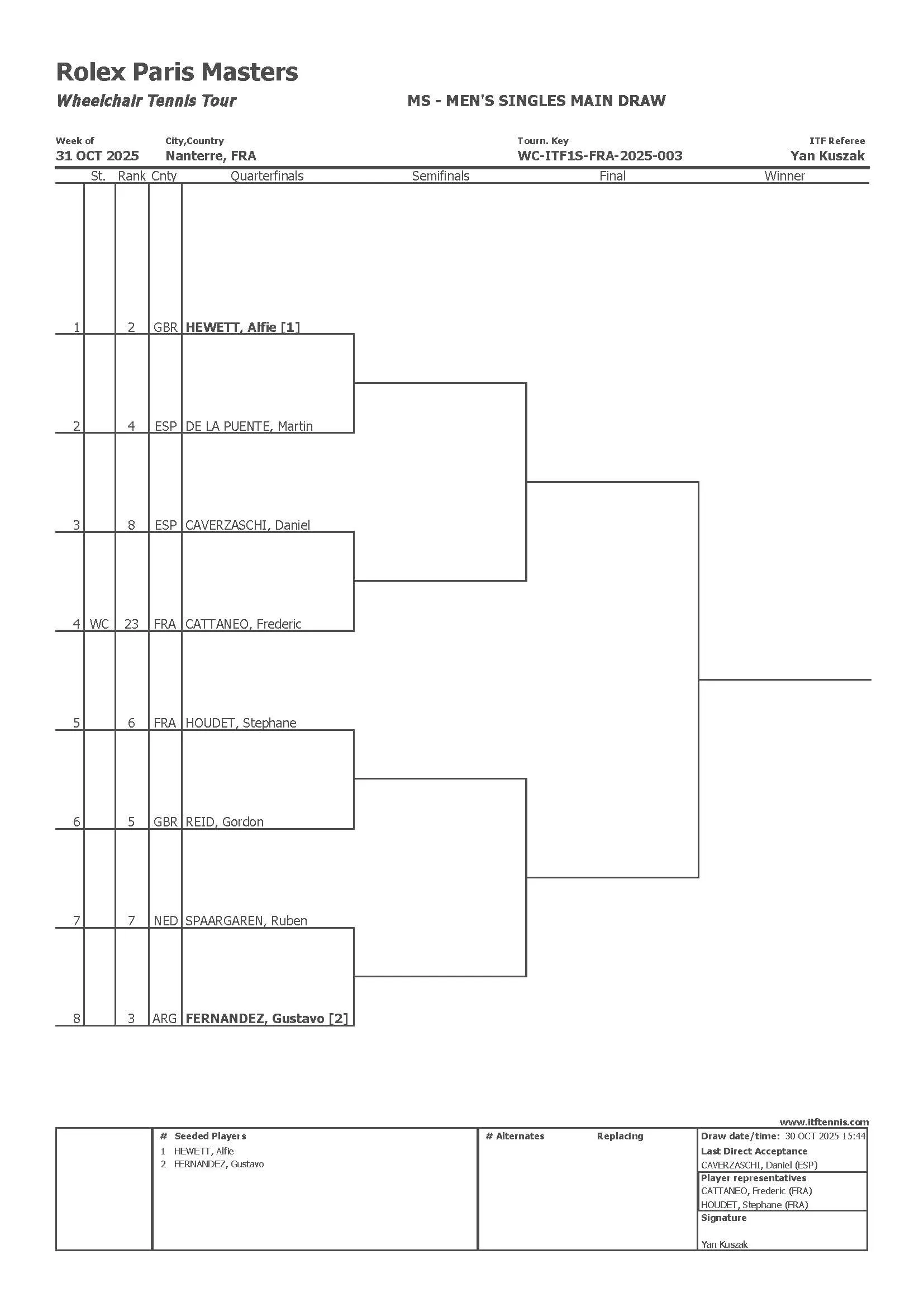 Le Français, qui a justement effectué le tirage au sort, affrontera le Britannique Gordon Reid en quarts de finale dans un remake de leur récente confrontation sur la dernière marche à Vienne. Champion à l’Open d’Australie puis finaliste à Roland-Garros et Wimbledon, Alfie Hewett (n°1) sera quant à lui opposé à l’Espagnol Martin De La Puente dès son entrée en lice. À l’opposé dans le tableau, Gustavo Fernandez (n°2) débutera sa campagne face à Ruben Spaargaren. Enfin, Frédéric Cattaneo, le deuxième Tricolore présent dans ce tableau de simple et bénéficiaire d’une wild-card, aura la lourde tâche de défier Daniel Caverzaschi.